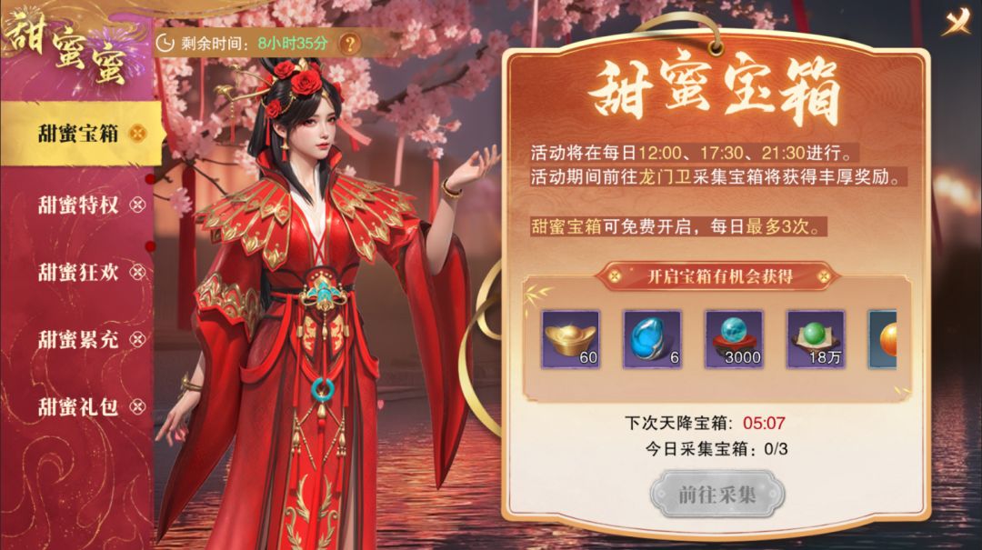 活动期间,每天12:00、17:30、21:30,龙门卫将刷新甜蜜宝箱,持续2小时。拾取宝箱可获得丰厚奖励,每天最多可拾取3次!快来抢宝箱,开启你的甜蜜惊喜吧!