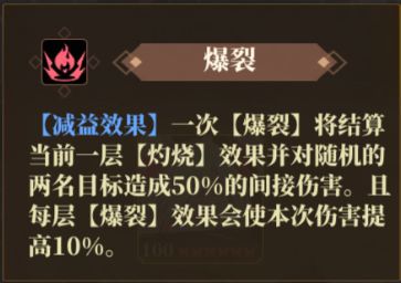每层直接结算一层【灼烧】效果并对随机两名目标造成50%的间接伤害,每层【爆裂】使本次伤害提高10%