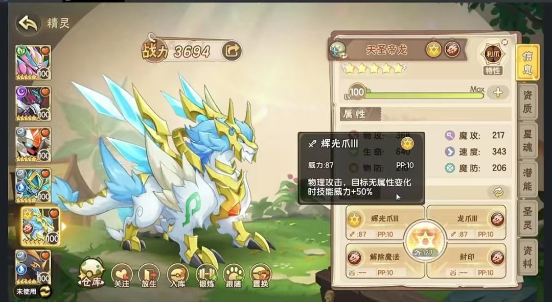 天圣帝龙在咱们队伍里作为冥王的平替,输出端平地增伤的辉光爪加上利爪特性,力度无需质疑,并且还有高贵的龙属性打我们的小帕不是轻松拿捏,功能端更是可以携带封印跟解除魔法,清陷阱跟抓人两不误。
