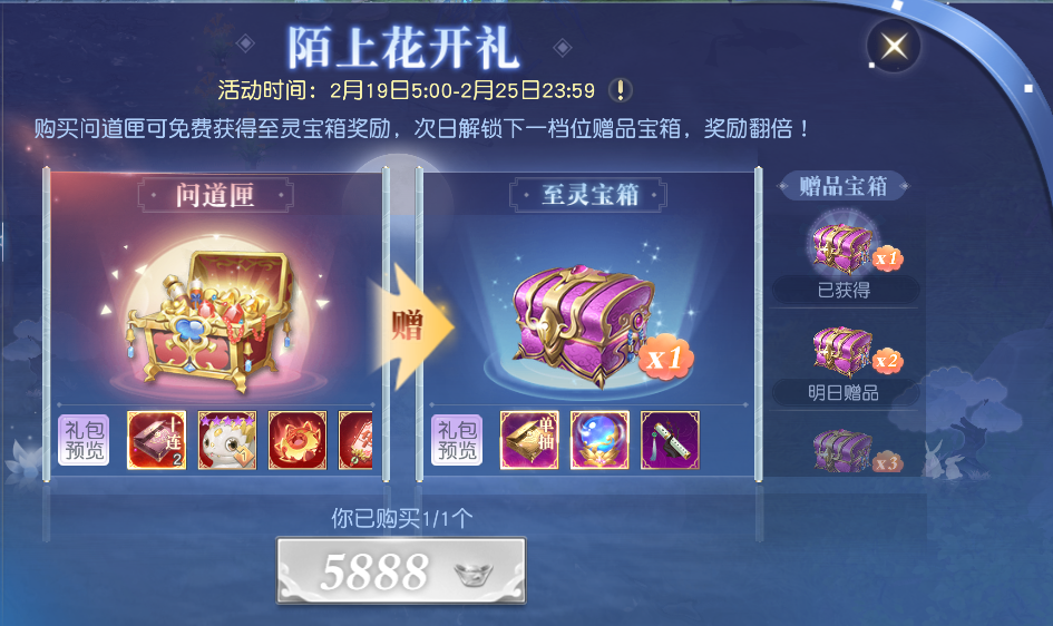 1.购买问道匣可免费获得当前档位赠品宝箱奖励,每天限购1次。