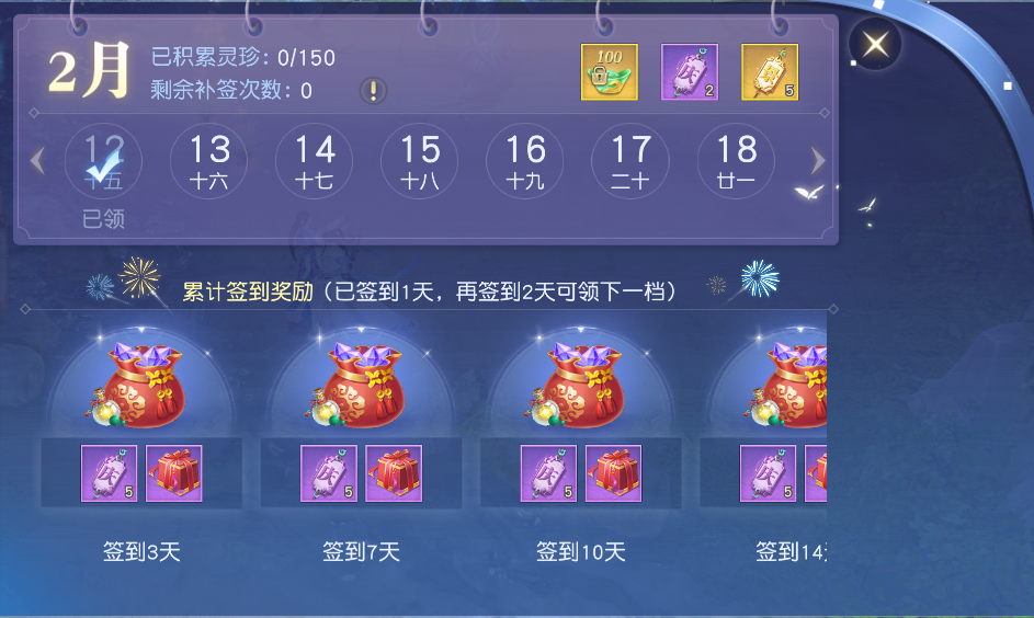 2.活动期间,若之前有1天或1天以上漏签,则获得一次补签资格。当拥有补签资格的情况下每获得150点活跃度,即可获得1次补签次数。