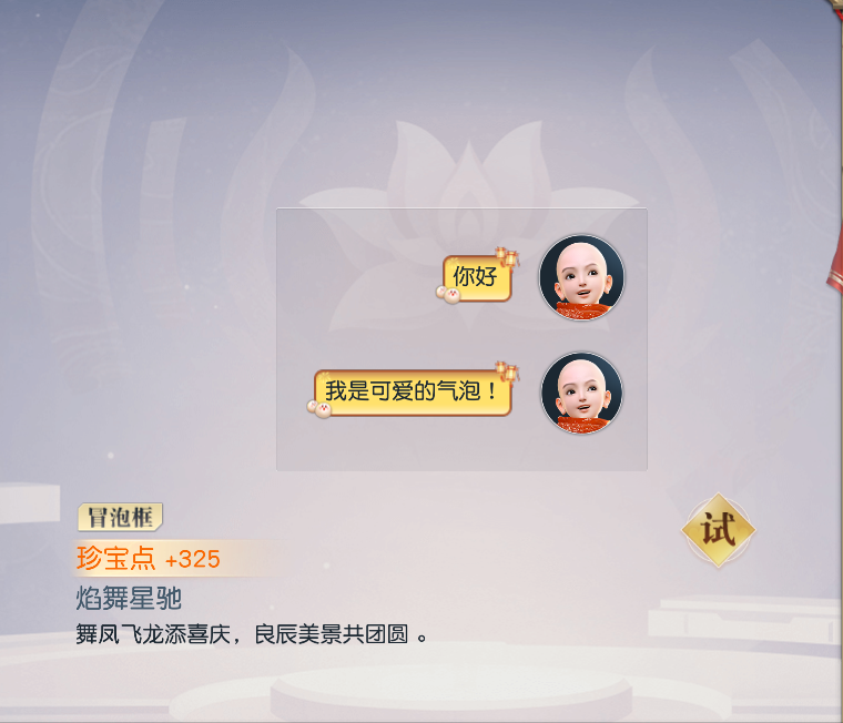 2.除购买者可获得礼包外,被赠送者会额外获得包括望月兮·凤头像框、龙凤和鸣·凤冒泡框在内的礼包。无论购买者在游戏内有没有结婚,均可以选择任一好友进行赠送。