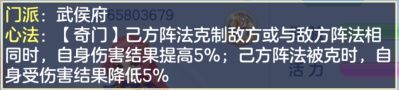 【奇门】己方阵法克制敌方或与敌方阵法相同时,自身伤害结果提高5%;己方阵法被克时,自身受伤害结果降低5% 心法解析 阵法克制对方或阵法相同时可以提升伤害,起到滚雪球的作用,阵法被克制时也能降低受伤缓解一定压力。