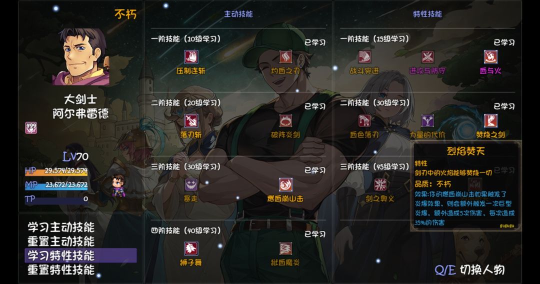牛大春书剑流堆粉碎半天上不了100,大剑士这里光双火剑就直接120+了,还要什么自行车被动:二阶被动选3,任意伤害挂灼烧,配合三阶右边被动,相当于总共4*(1+1.5+0.35*5)=17的基础倍率,而且因为炎爆是火焰伤害,所以能吃满火剑的所有提升