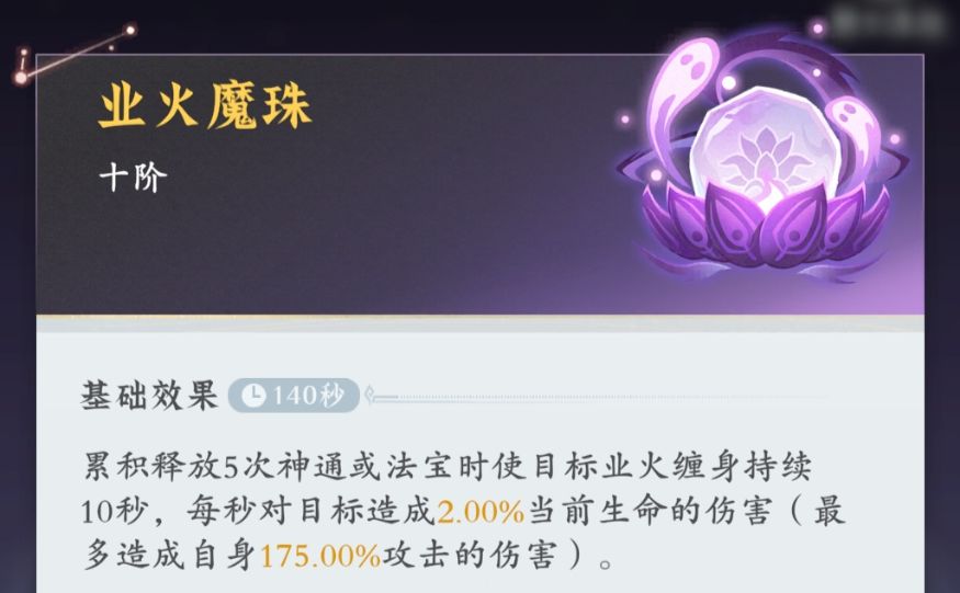 业火——焚罪孽,燃因果,一焰净丹心业火补足伤害,需要累计5次使用神通法宝才能触发(预计十几秒的成形期),最高可以持续对目标造成20%的伤害。