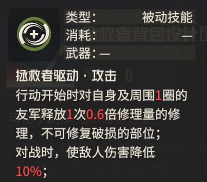 一是行动开始时对自身及周围1圈的友军释放1次0.6倍维修,但是不可修复破损部位,对自身的维修是任一维修背包都具有的,所以这里实际上就是把范围从自身扩展到周围1圈,是量变,然后这个维修量有多少呢,其实就是相当于机械师回合结束时的那一下维修。