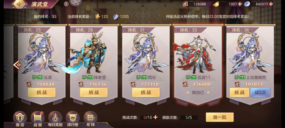 至此,前期阵容已经无敌,推图+PVP都是见谁秒谁,然后狂刷【黄天秘境】,优先给陆逊装备精炼