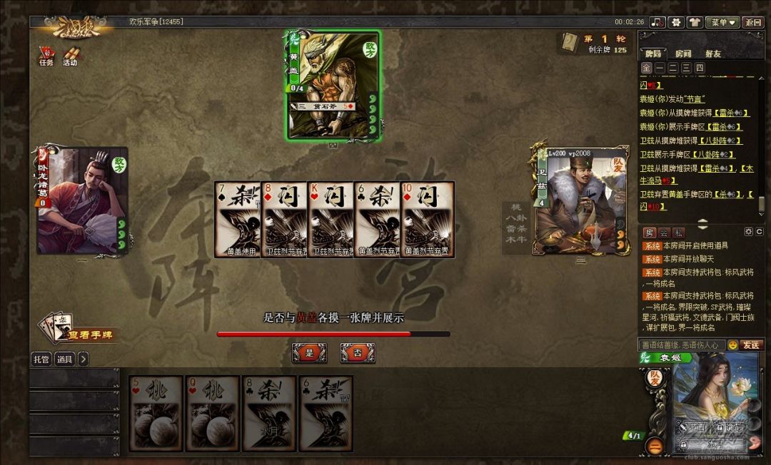 如果两个人摸的牌是同颜色的,就能继续再发动此技能。图中,黄盖杀卫兹掉血,卫兹弃置两张手牌后,发动技能。袁姬获得并展示黑色的雷杀,卫兹获得并展示黑色的八卦阵,这样技能不失效。当拆掉黄盖两张手牌后,系统提示还能继续发动技能。