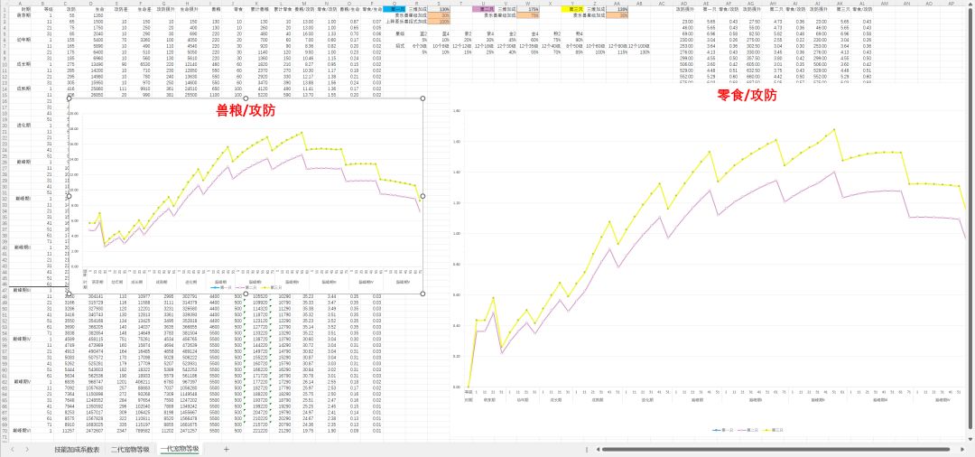 一、表用法:通过对表格的效益折线让兽粮/零食效益最高就可以啦~等完善好我会录制一个视频!表里可以查到每十级的/从1级起的属性增加/材料消耗,以及他们之间的比值(反应单位属性投入的材料数量)(不习惯这样比可以反比一下)