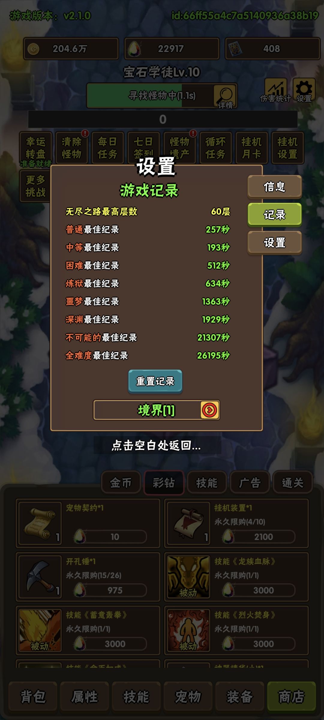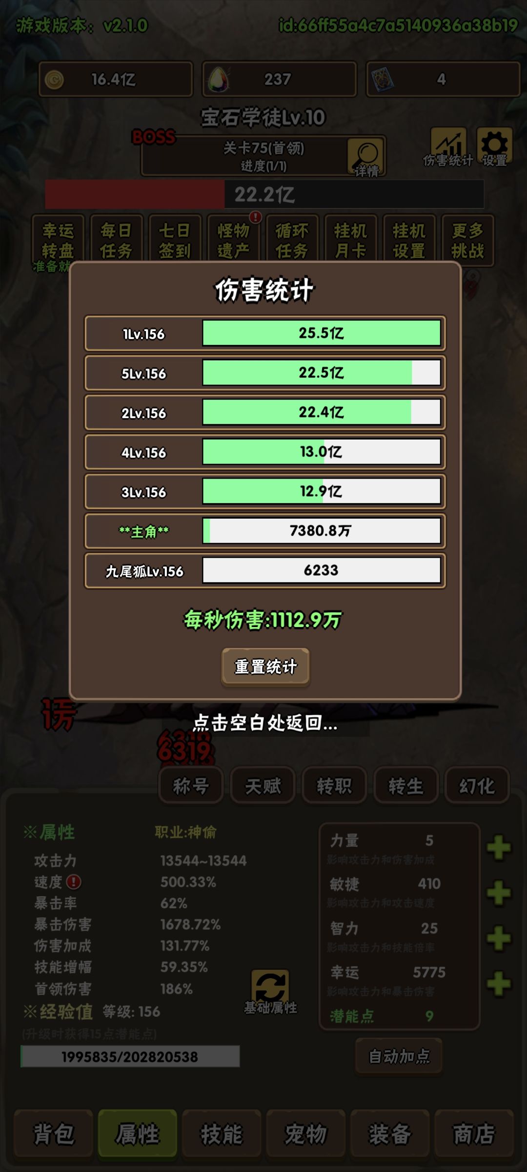 重点三:天赋,怪物血量减少拉满,宠物攻击拉满,宠物对首领伤害拉满。主角速度拉多少算多少(偷取经验升级必须非点击技能有效果需要行动条)