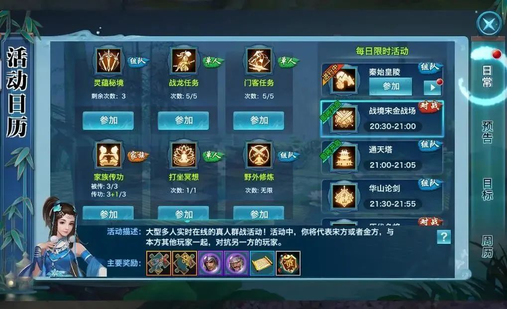 战境白虎堂:2月13日-4月8日战境通天塔:2月13日-4月8日战境门派竞技:3月3日、3月31日、4月7日战境武神殿:2月13日-4月6日战境宋金战场:2月19日-4月8日 每周三20:30灵蕴秘境:2月17日-4月8日