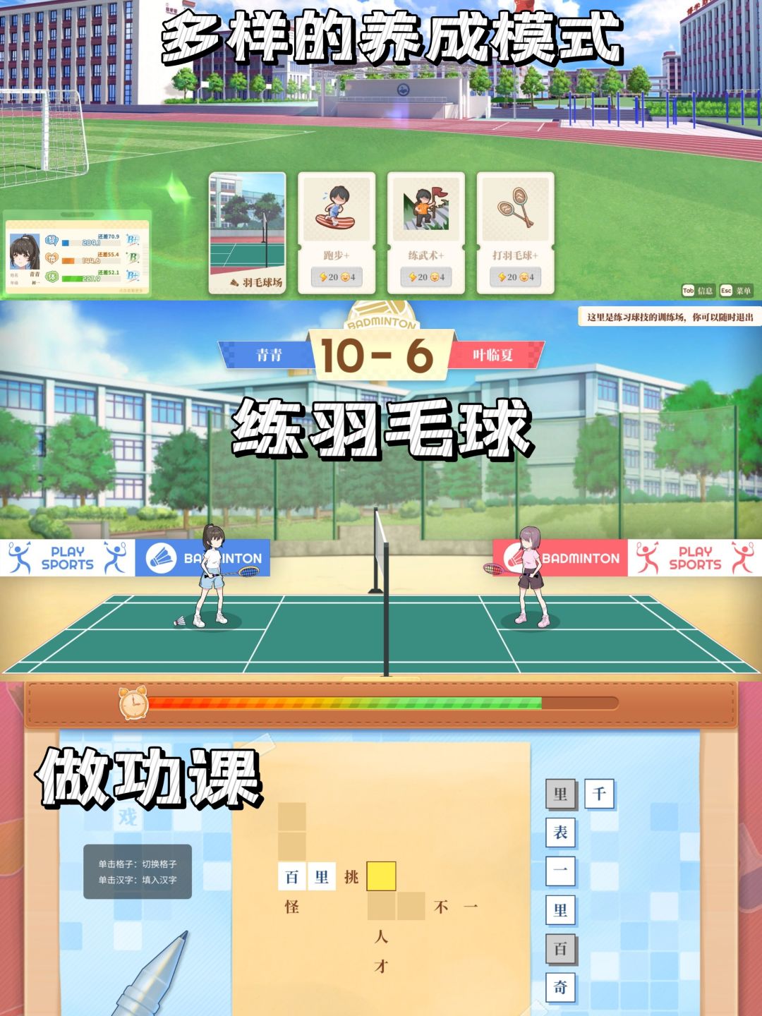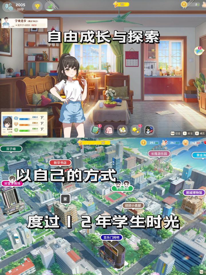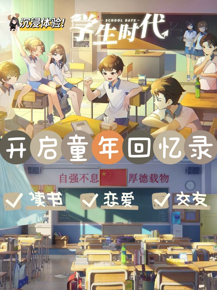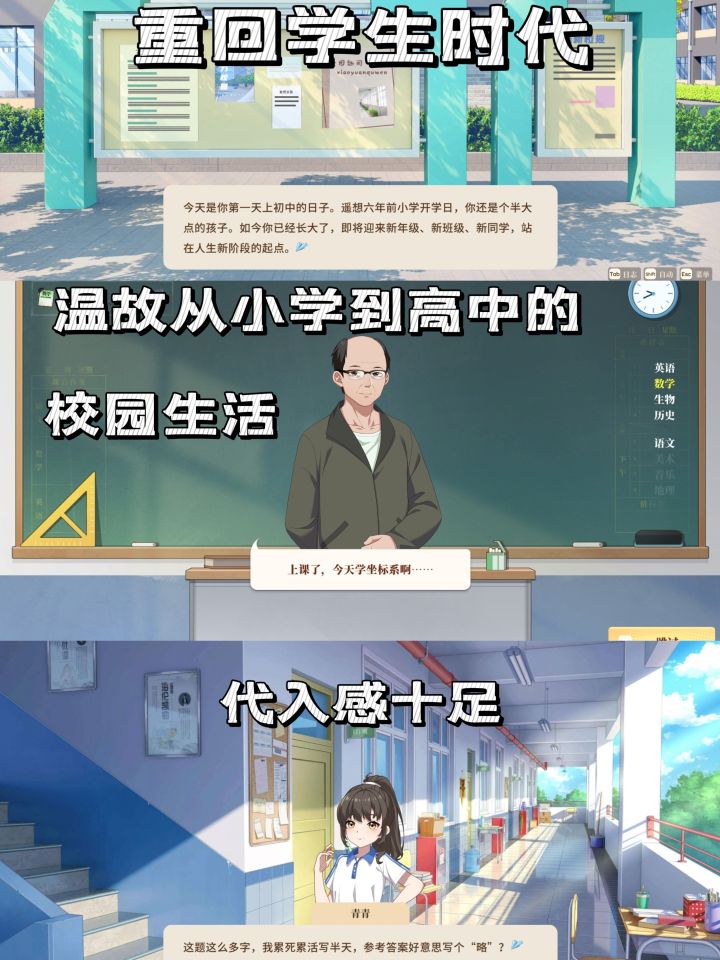 1️⃣游戏从小学一年级开始,到高中毕业结束,带人完完全全地回顾了一遍12年的学生时光,这段时间是完全自由的,不但可以搞学习升数值,还能逛逛小卖部,去电子阅览室打打游戏,跟同学们外出玩耍,偶尔因为考试亚历山大,偶尔为了学校的竞赛全力以赴,每天都有无数故事在发生,那个充实的年代就该如此。