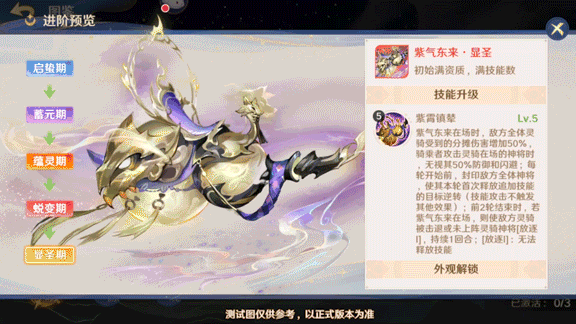 新增天启灵骑“紫气东来”,详细如下: 满阶紫气东来:紫气东来在场时,敌方全体灵骑受到的分摊伤害增加,骑乘者攻击灵骑在场的神将时,无视其一定百分比数值的防御和闪避;每轮开始前,封印敌方全体神将,使其本轮首次释放追加技能的目标逆转(技能攻击不触发其他效果);前2轮结束时,若紫气东来在场,则使敌方灵骑被击退或未上阵灵骑神将[放逐I],持续1回合;[放逐I]:无法释放技能