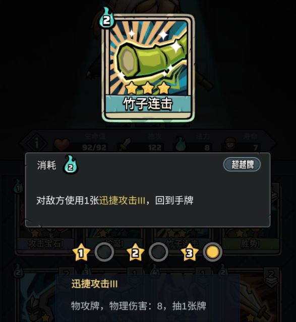 种族专属卡牌:”竹子连击“,机制简单就,是用1次,系统给你出1张”迅捷攻击“,这张牌使用时是按超越牌使用,触发的攻击是物理攻击牌,所以可以触发多种手办、宝物、任务效果。想要达成无限出牌也特别简单,拿2张”超越宝石“、或者1张”超越宝石“,再用”复制“复制张”超越宝石“,都可以达成无限出牌。也因为这个特性,是日常打”尖塔木屋“就不容易翻车的角色之一,打”尖塔木屋“水晶留着删牌就行。