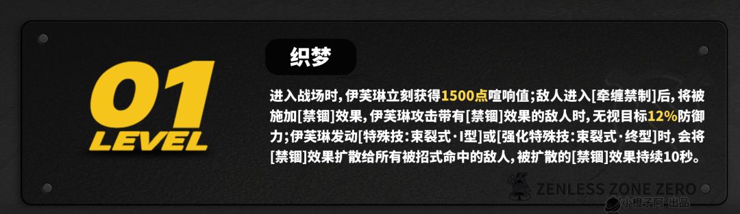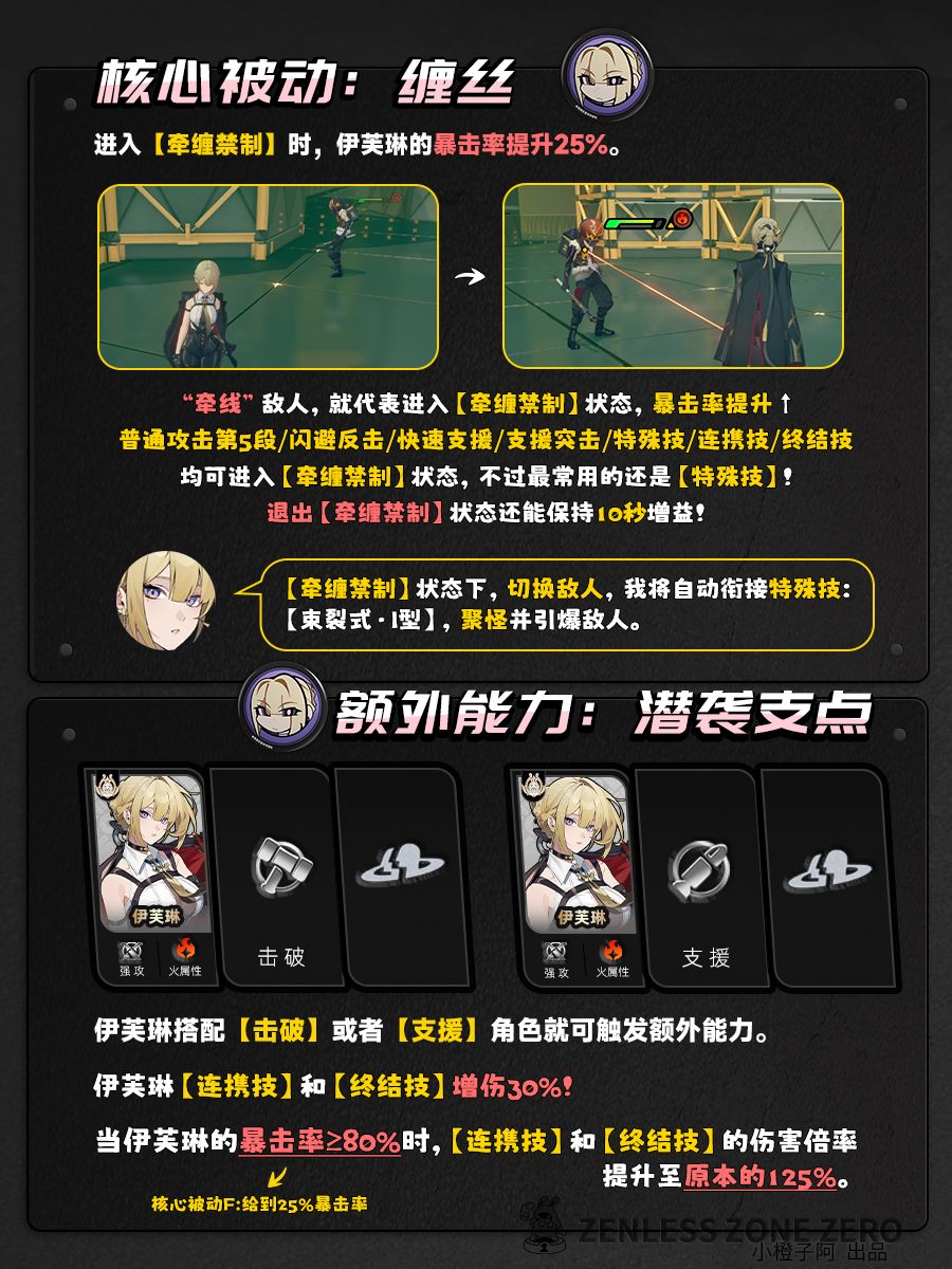 本期小橙子将带来绝区零限定强攻角色—伊芙琳的角色攻略,全文将讲解伊芙琳的技能机制、音擎选择、驱动搭配、影画解析、队伍搭配以及角色总结。