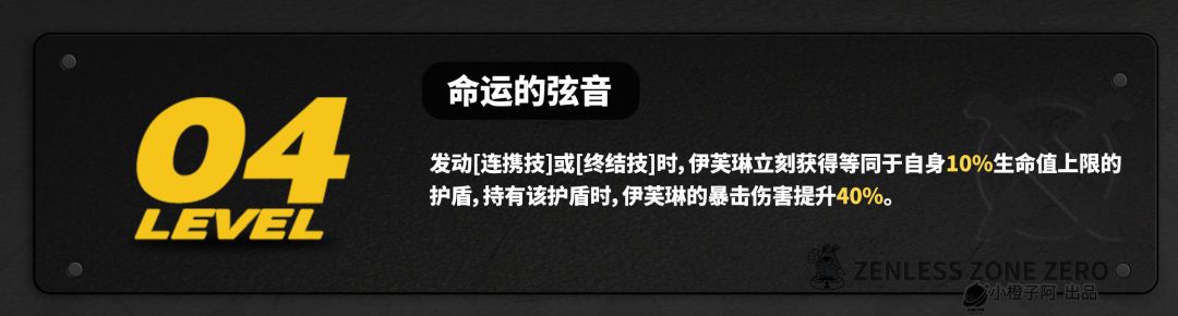 伊芙琳释放【连携技】或【终结技】会获得护盾,为伊芙琳带来了一些生存能力,同时有护盾时提供40%暴击伤害加成。