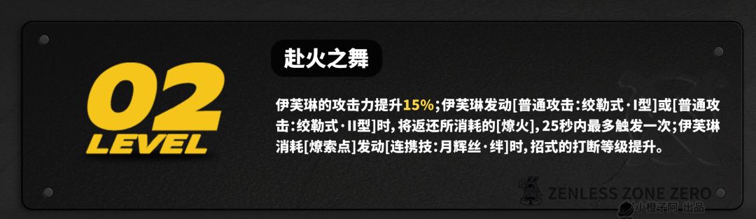 ——首次释放终结技后,伊芙琳只需再攒满2个【燎索点】即可释放【连携技】,门槛将大幅降低,大幅提升伊芙琳输出效率。