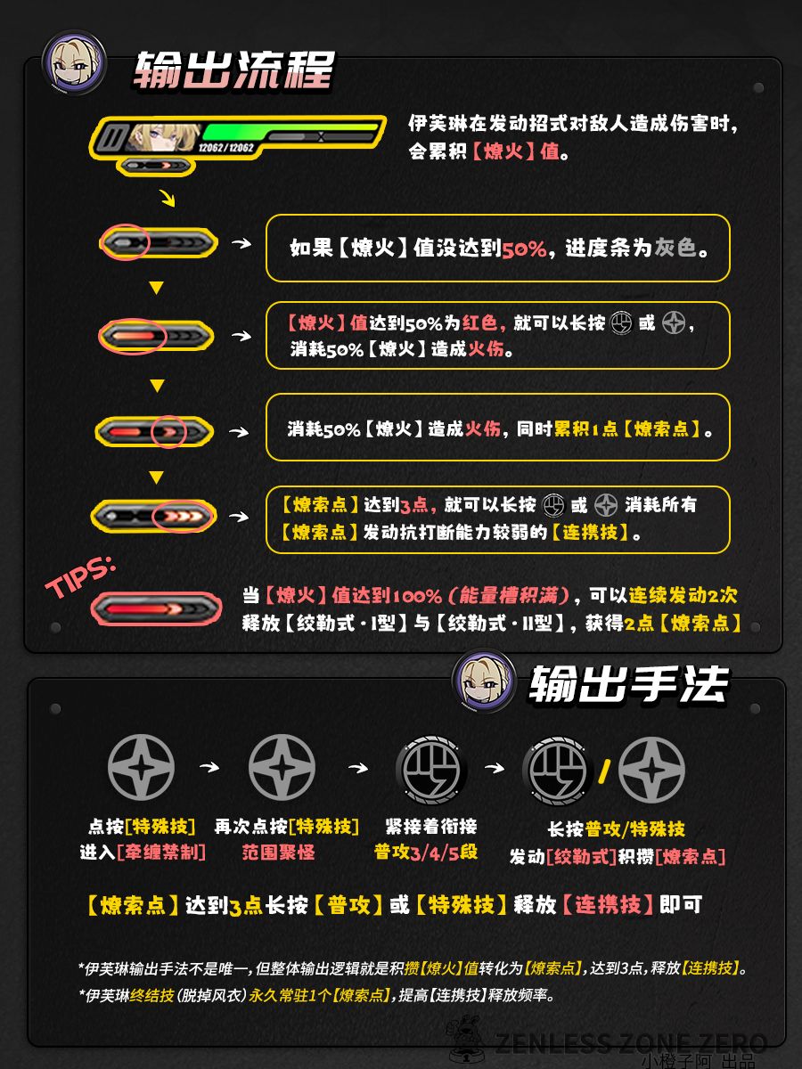 伊芙琳是一位火属性的强攻代理人。作为强攻角色,伊芙琳其实输出方式并不复杂,就是通过【特殊技】或【普通攻击】快速积攒【燎火】值,达到50%以上后即可长按普通攻击打出伤害的同时,将【燎火】值转化为【燎索点】,当【燎索点】达到3点时即可释放打断等级较弱的【连携技】进行爆发输出。