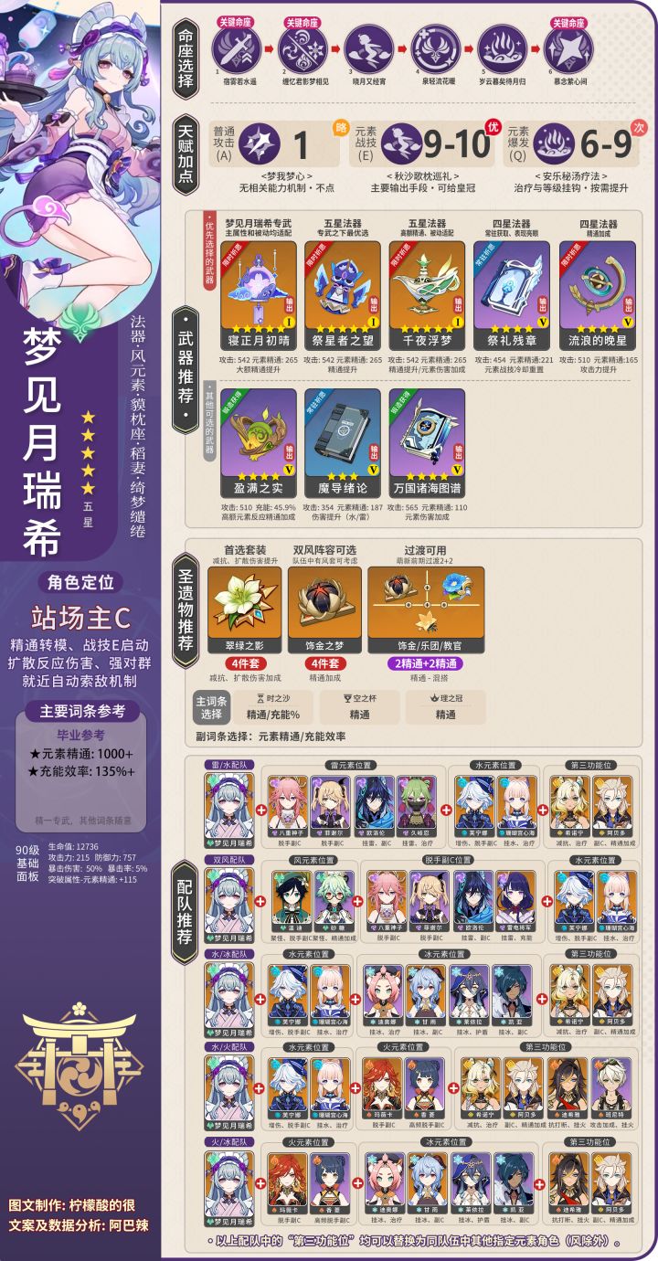 一张图带你搞定梦见月瑞希的圣遗物、武器、配队、天赋加点、参考面板、命座选择等一系列问题~