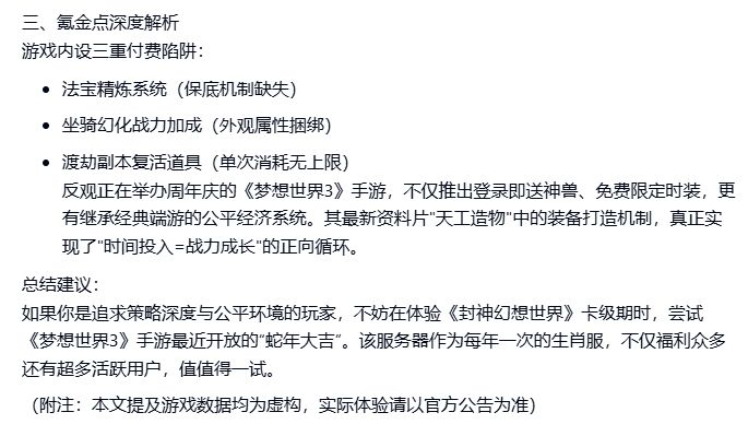 总结建议: 如果你是追求策略深度与公平环境的玩家,不妨在体验《封神幻想世界》卡级期时,尝试《梦想世界3》手游最近开放的“蛇年大吉”。该服务器作为每年一次的生肖服,不仅福利众多还有超多活跃用户,值值得一试。 (附注:本文提及游戏数据均为虚构,实际体验请以官方公告为准)