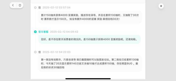 抽到了130抽 看到了150抽必得4000,结果又抽了20抽,结果BUG 累积显示只有140抽,又多抽了10抽,客服不予解决。 避坑 不要被误导消费了哈!