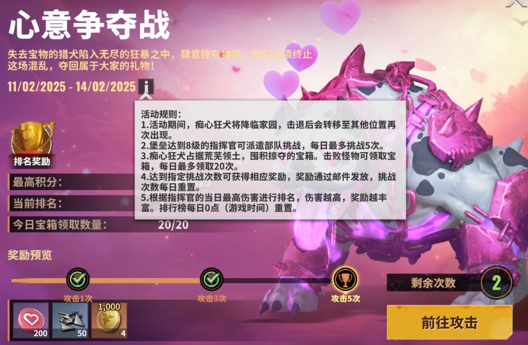 每日5次进攻次数,20次宝箱领取次数,完成获得心意币、纪念币、钻石等奖励,击杀猎犬后抢宝箱手速要快!