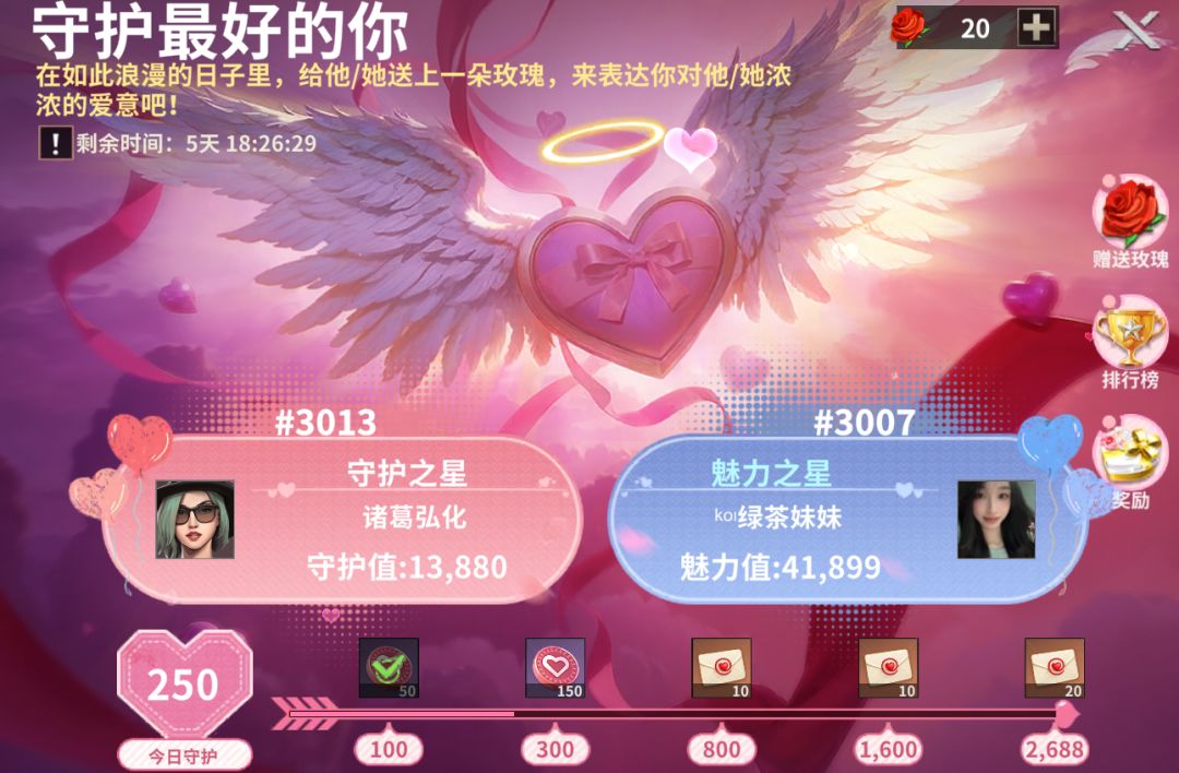 1.守护榜:赠送他人道具获取守护值。玫瑰(1守护值)、告白情书(10守护值)、爱神之箭(500守护值),排名前十奖励永久翅膀—至臻天使之翼,属性非常优秀。