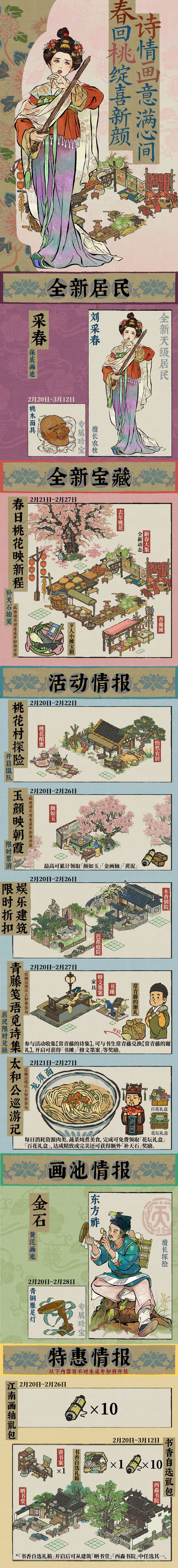 全新3*4动态建筑「新春大集」入驻江南!奖池内含建筑「去年桃花」、「金画轴*10」、「建筑画轴*12」、「补天石*300」等好礼,第一次抽奖是免费的,知府们记得来试试手气!