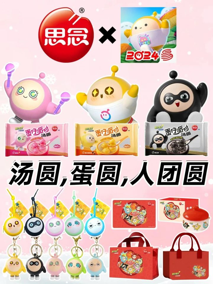这次和思念汤圆的联名一共三种口味:有黑芝麻搭配去皮核桃的蛋小黄;还有黑亮饱满的黑芝麻汤圆蛋小黑;以及糯糯叽叽的草莓汤圆蛋小粉!