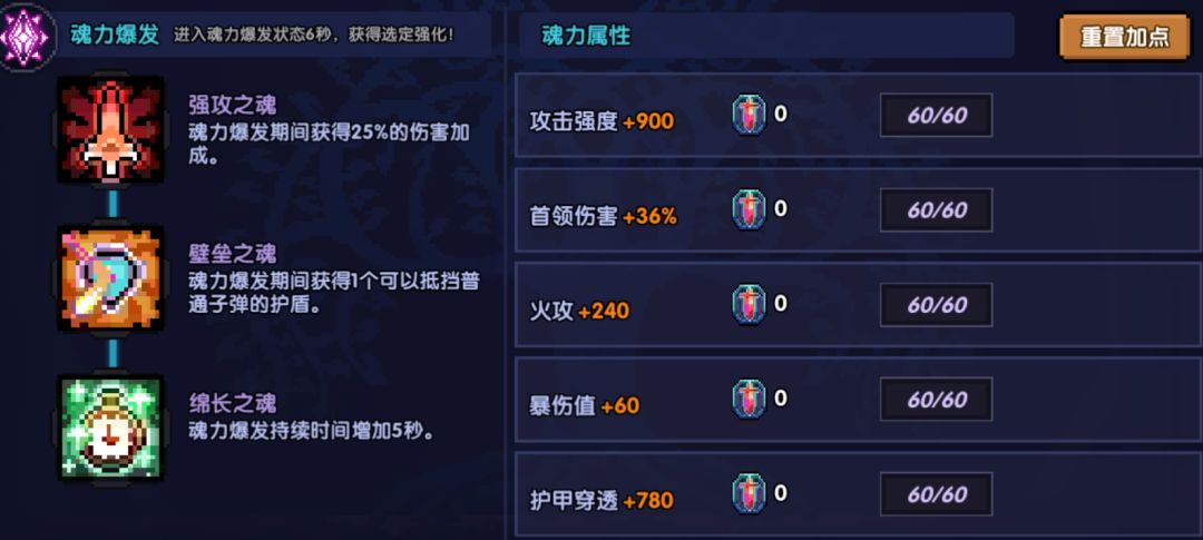 对于魂点不够用的同学,在满足穿透和暴击的前提下,各项属性平均分配点取,或者可根据自己面板来自己调整加点