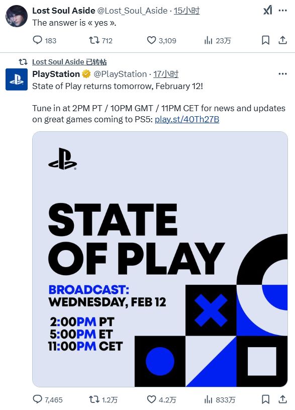 近日,索尼宣布了将于北京时间2月13日早上6点举行新一期State of Play直播的消息,之后国产动作游戏《失落之魂》在X上转发了索尼的直播公告,并在新推文中写道:“答案是肯定的”,这或许是暗示了游戏将在State of Play直播中亮相,该作此前已经确定将于2025年发售,登陆PS5和PC。