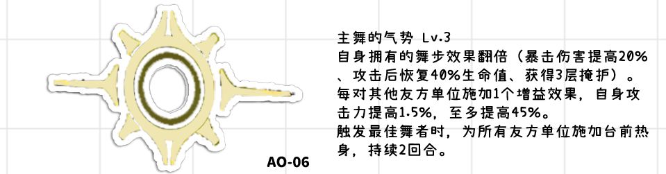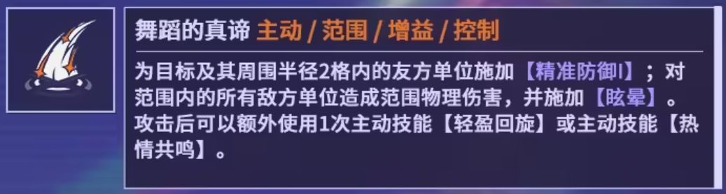●获得舞团核心,这里简单记忆为主动技能buff同时能给自己,最主要的就是低椎时让小舞buff乘2,加快叠穿防效率。●指令追加在第一回合的时候能大幅度加快叠穿防的层数一般会接主动技能2舞蹈的真谛,毕竟前期叠穿防是核心,后续则可以看情况使用技能。●为全队施加稳态攻势Ⅰ,这个算是稍微弥补了一下物理队缺少异位伤害导致的破稳效率稍微有点低下的问题。但是治标不治本破稳效率总体还是稍微有点偏低。