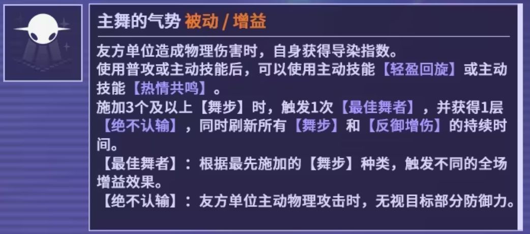 ●因为因为绝不认输的独特机制(不能有异位伤害)的存在所以队友造成物理伤害时自身获得一点导染还是非常容易触发的,也就是主动技能1即兴舞步时很容易触发额外消耗导染无视30%防御的特效的。●核心机制,普攻和主动攻击之后能跳一次小舞,提供生存、爆伤、以及负防御机制的buff,同时用于叠穿防层数。●施加三个小舞buff之后就会触发最佳舞者(大舞)并且获得一层绝不认输,这里需要注意一下是三个及以上也就是,你上完buff之后比如获得了4层,这样获得绝不认输之后是会回到0层的不会保留一层。●最佳舞者和刷新buff算是提高了buff覆盖率以及非常不错的治疗能力,虽然不能和那些治疗角色类比,但是在低压环境下完全够用了。