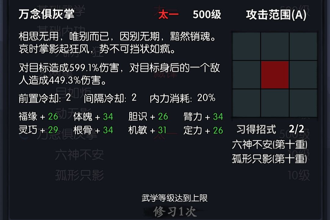 ②前置冷却2,间隔冷却2。意味着放出第一次武学后,每隔一回合会放一次黯然销魂掌。在没有减cd的情况下,第三、五、七、九、十一回合都会使用黯然销魂掌。