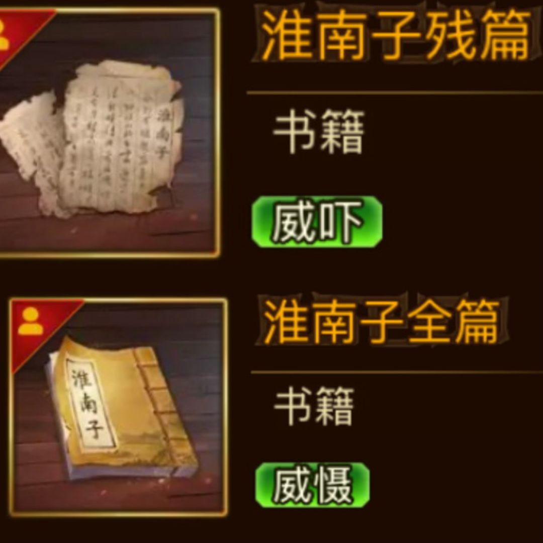 荀彧也举杯说道:“那我也想到一个例子,起初我听说袁绍从豫州得了一份《淮南子残篇》,技能是威吓,对4格内任一敌军施加溃逃。我想这倒是很不错,溃逃也是咱们阵营指挥技专长,可很好叠加啊。后来丞相专门安排采买了《淮南子全篇》,其技能威慑,不但对敌军施加溃逃,还能返还体力或额外增加层数,产生大量伤害,二者天上地下,不可同日而语啊。”