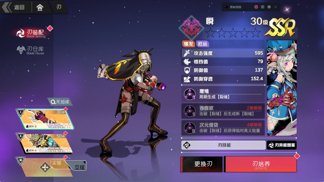 获取:常驻池抽到瞬(输出)、灵柩(辅助)中的一把后在兑换里兑换相应没有的刃,并兑换瞬的魂器黑目,up池抽取龙枪(破平衡,贝鲁贝尔)。后续可换出灵柩的魂器幽冥桩。(也可舍弃龙枪,用绯雨,增加双爆)