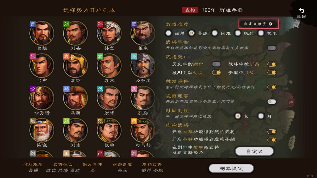 点击剧本设定,在游戏难度位置选择自定义难度可调起参数面板,可根据个人喜好进行设定。(自定义难度会增加*与常规难度进行区分)