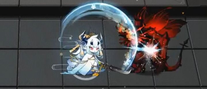 这种服装风格虽说在二次元里很常见,但放在方舟里还是相当令人惊艳的,一方面角色的姿势很凸显身高优势,另一方面鬼角的大小和形状的对比加上人与灯饰的高度对比,会营造出一种百鬼簇拥的感觉,天生就有上位者的威势和大气