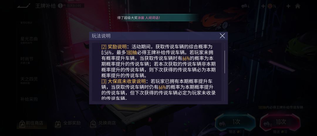 目前所有豪车、工坊、盲盒车都统一收录在王牌补给中抽取。抽取规则为上图,抽中整车概率为0.56%,保底180抽,第180抽必中整车,有2/3概率为本期up车,1/3概率为其他车。若抽中非up车,则下次180抽内抽出整车必为up车;若已有up车再抽中up车/或重复车,则下次180抽内抽出整车必为未获取车。(抽到重复车则返100积分,每次抽取赠送1积分,360积分即可换取涂装、750分可换任一豪车)。