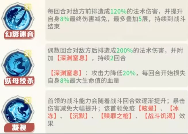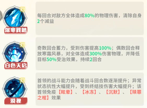 1、布阵为单排1、3站位的双目标boss。2、每回合对敌方前排进行攻击并提升自身最终伤害减免。3、偶数回合对敌方后排施加深渊窒息[攻击力降低]。4、暴伤大幅减免。