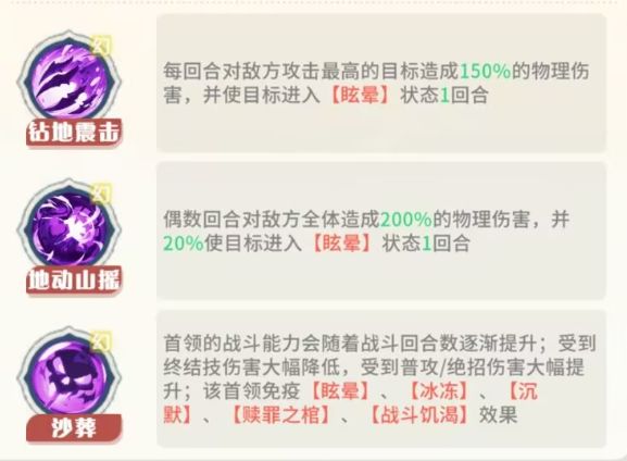 1、布阵为单排1、2、3站位的三目标boss。2、每回合对敌方最高攻击单位百分百眩晕。3、偶数回合全体概率眩晕。4、受终结技伤害大幅减免,受普攻/绝招伤害大幅增加。