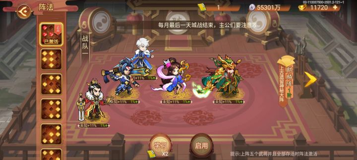 4 也是最重要的一步就是用麒麟阵,因为麒麟阵的未知效果是全队平摊所以受到的攻击,这也是为什么需要能抗能打的武将