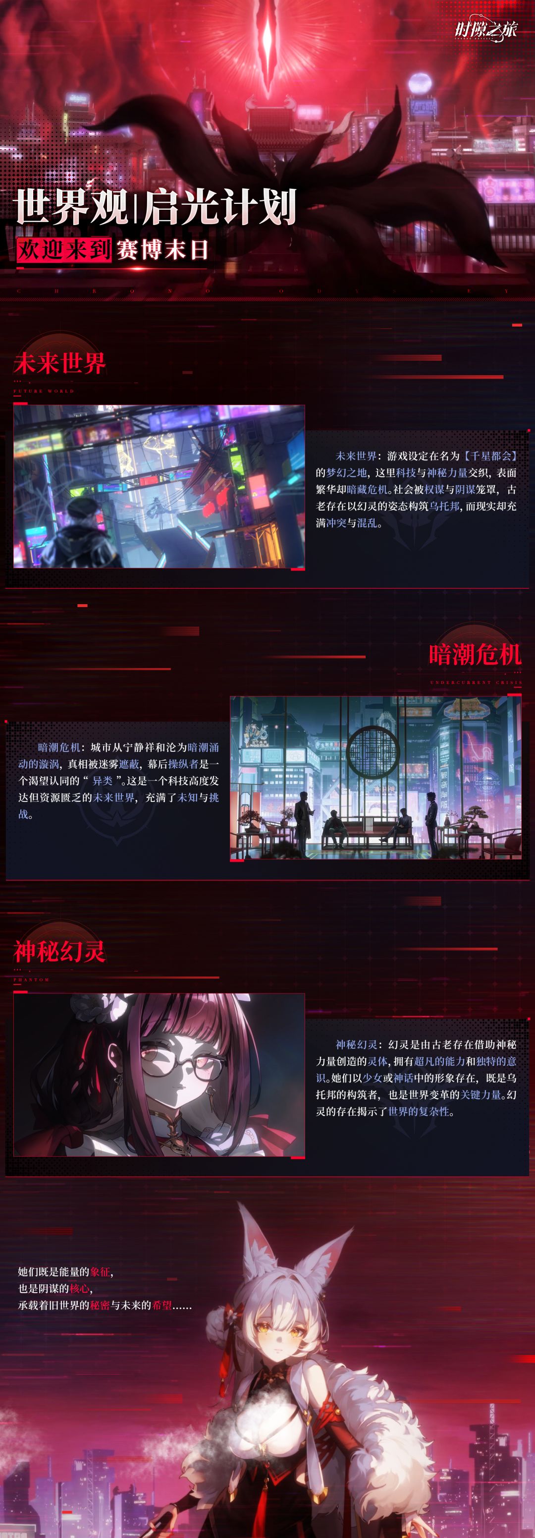 「时隙之旅」的大世界概念设定基于东方混元赛博未来世界,在这个霓虹与东方古韵交织的虚幻繁荣之下,引航者们该如何追寻属于你们心中的和平与秩序呢?在踏入时空之隙之前,不妨让我们一起来了解一下这个世界~