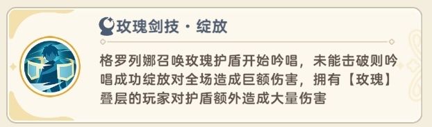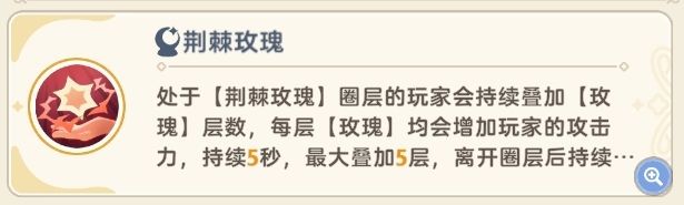 板块上会出现紫色增伤板块,站在紫色增伤板块上会获得{玫瑰}buff,具体表现为玩家头顶有5朵玫瑰组成的环