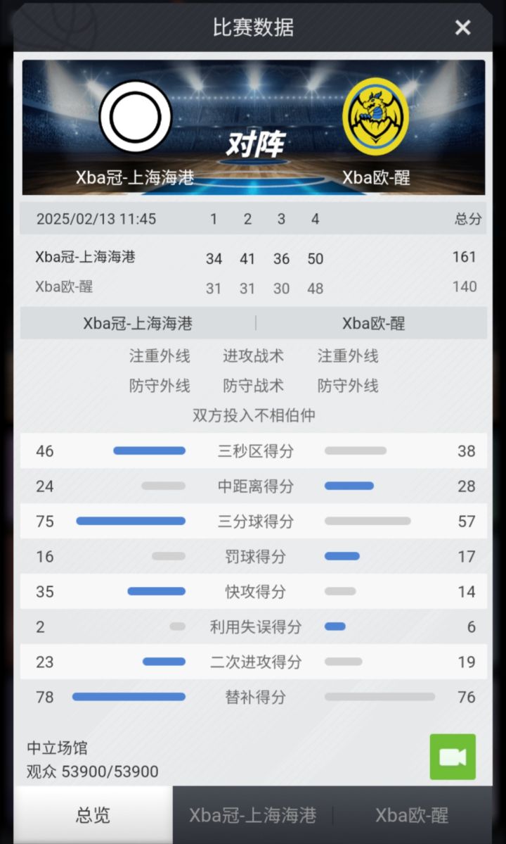 赛果战报:【迪尔德里姆吉姆54分对飙范德雷48分】Xba冠上海海港161比140轻松取胜。赛前支持率为9比27,Xba上海海港展现黑马之资。