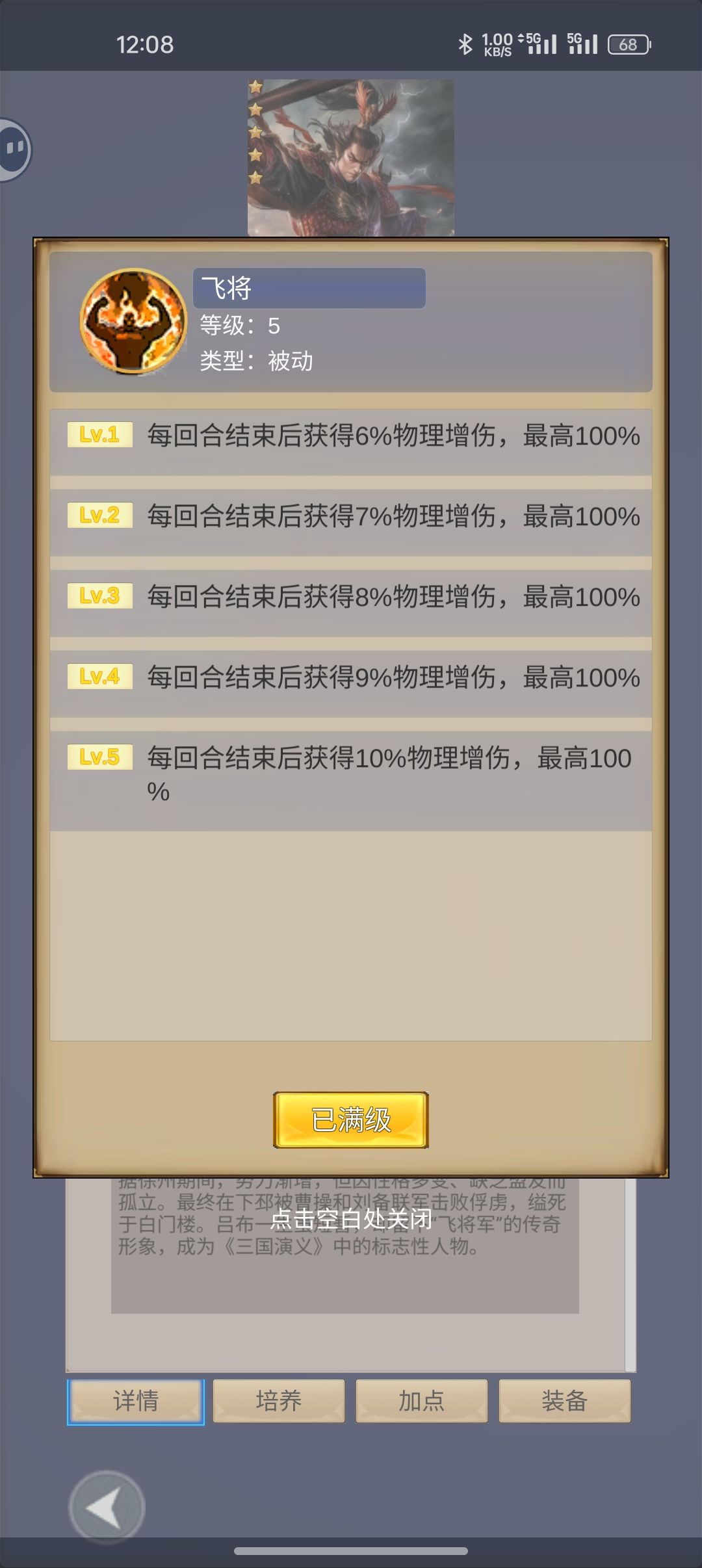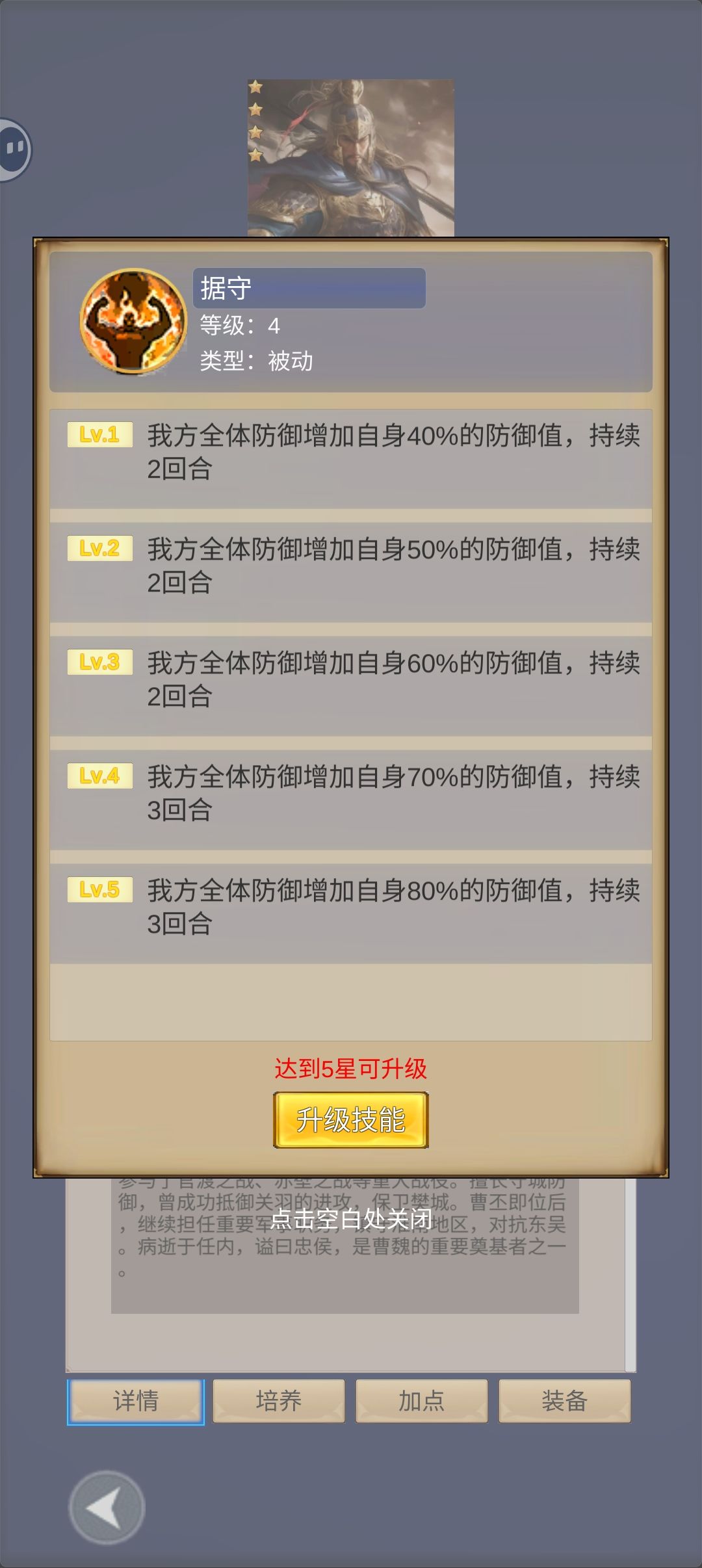 图一、三、四选气血,图二、五选攻击,后面技能选逍遥剑法,单体攻击一级120%攻击,满级180%攻击,加点全体质,目前主角最大的作用就是活着分担伤害。然后就是抽将,要抽到曹仁(主动技能有晕眩),加群看公告找管理要个吕布,否则游戏会很费劲,当然最终这些将都会有的,就是游戏进度慢。主角15级时用兑换码有100抽,当抽到曹仁后就停止抽将,再找管理要吕布,这样后面抽将就可能抽到吕布,那会让你战力大增。如果抽不到曹仁,重新建个角色再来一次,总会有的。后面抽吕布也是如此,只不过比较麻烦而已。这是个单机游戏,早一天晚一天没有关系,但是将的搭配是很重要的。20级上吕布曹仁,30级前吕布曹仁加点加血,保证存活率,后面吕布可以加血和攻击。培养优先吕布攻击和血,曹仁血和速度。非套装装备优先1武器2鞋子3项链。有钱记得升级家园,这个游戏角色很费蓝。