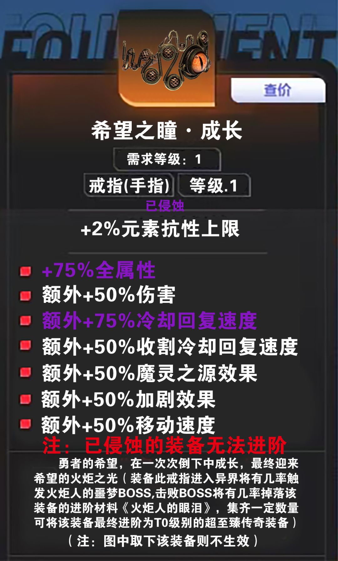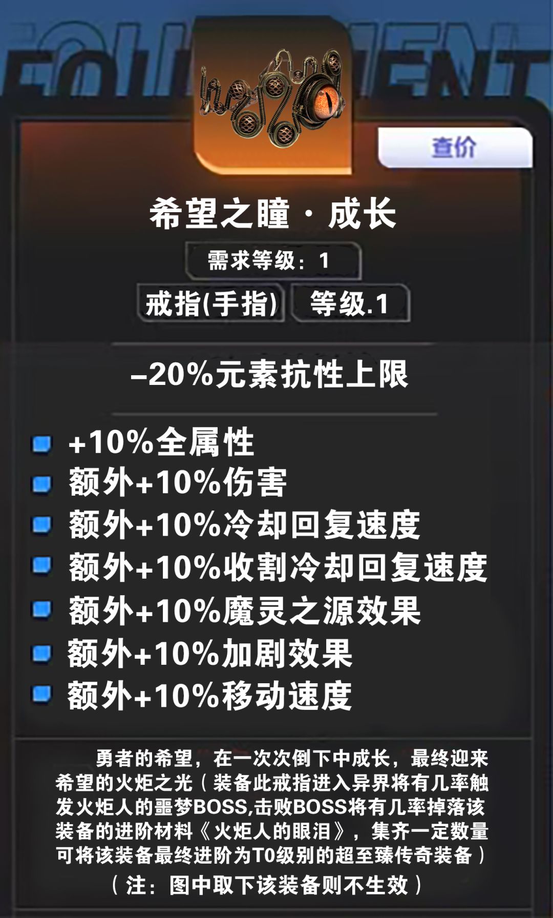 传奇装备简介:勇者的希望,在一次次倒下中成长,最终将迎来希望之光(装备此戒指进入异界将有几率触发火炬人的噩梦BOSS,击败BOSS将有几率掉落该装备的进阶材料《火炬人的眼泪》,集齐一定数量可将该准备最终进阶为T0级别的超至臻传奇装备)注:图中取下该装备则不生效。