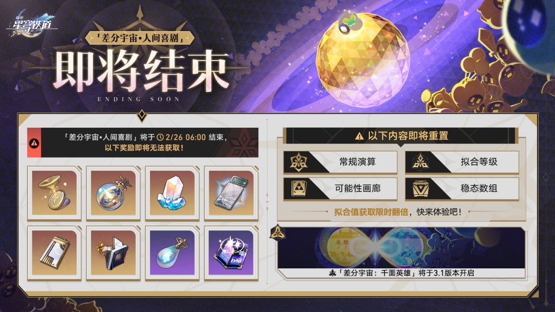 「差分宇宙•人间喜剧」即将在2/26 06:00结束,结束后奖励无法获取!开拓者别忘记挑战并领取命运的足迹、星轨通票、星琼等奖励!