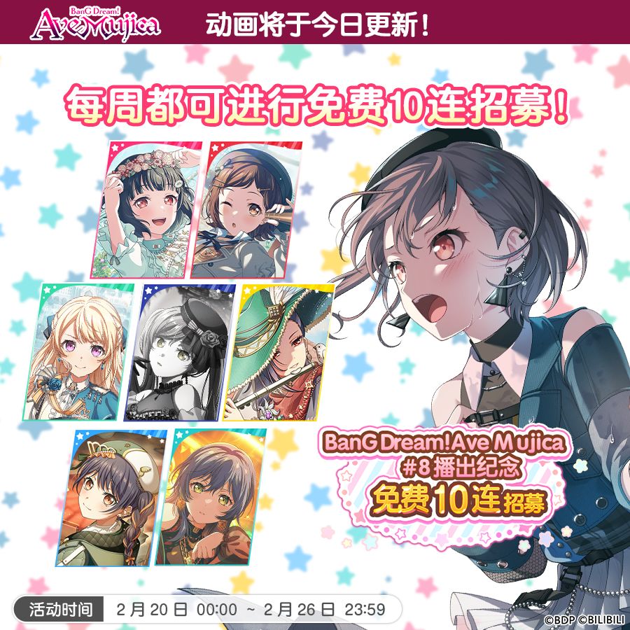 为纪念TV动画「BanG Dream! Ave Mujica/颂乐人偶」开播,游戏内现已开启「BanG Dream! Ave Mujica/颂乐人偶 #8 播出纪念10回免费招募」!并且,此后每周随着动画的播出都将进行1次免费10连招募!