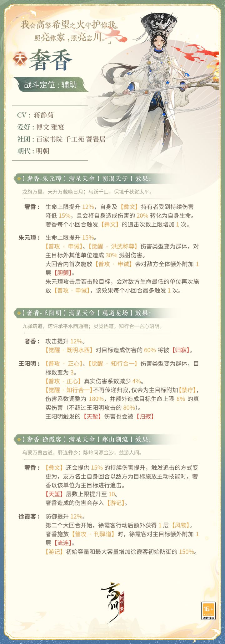 来到忘川的奢香将作为辅助名士出战,使君大人快戳下图了解详情吧!技能以上线实装为准~